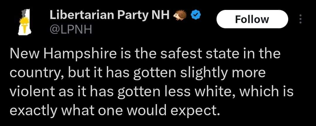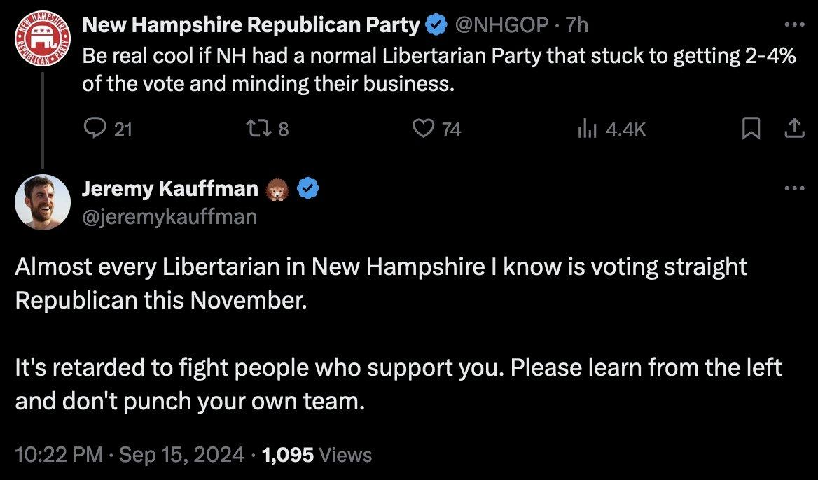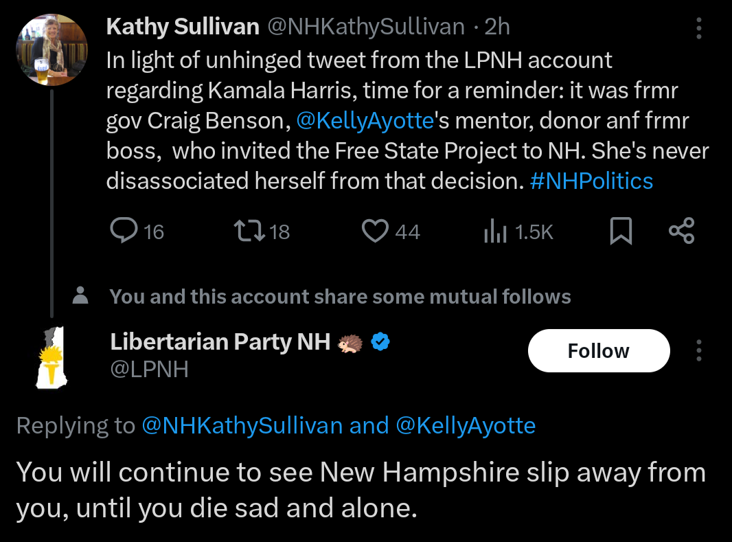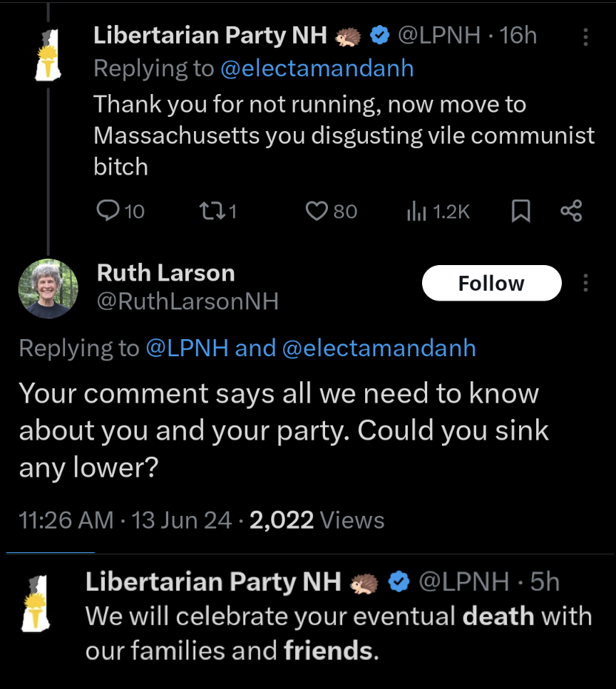 - If you are a Free Stater trying to build “liberty in our lifetime”, then you want to attract libertarians to New Hampshire. Prospective Free Staters expect that the LPNH is representative of the libertarian community in NH. The current messaging suggests we have a toxic community and repels libertarians.